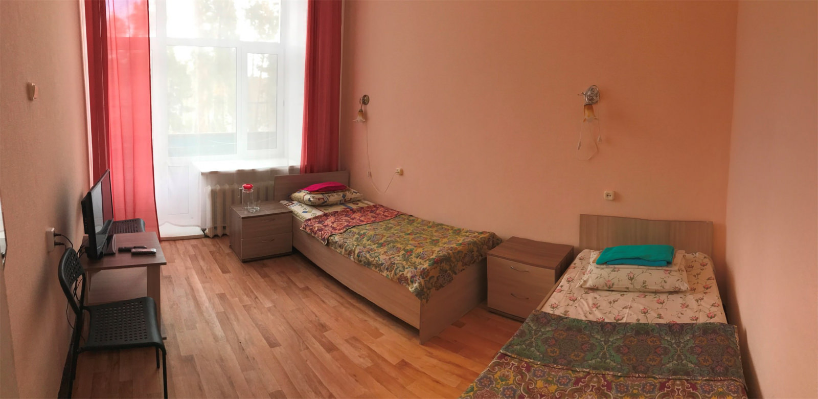 Площадь номера - 15 кв.м. 2 осн. места. 1 доп. место. Балкон. Мебель: вешалка, зеркало, кровать односпальная (2), прикроватная тумбочка, стол, стул, шкаф. Оборудование. Санузел. Сервис: смена полотенец, смена постельного белья, уборка номера.