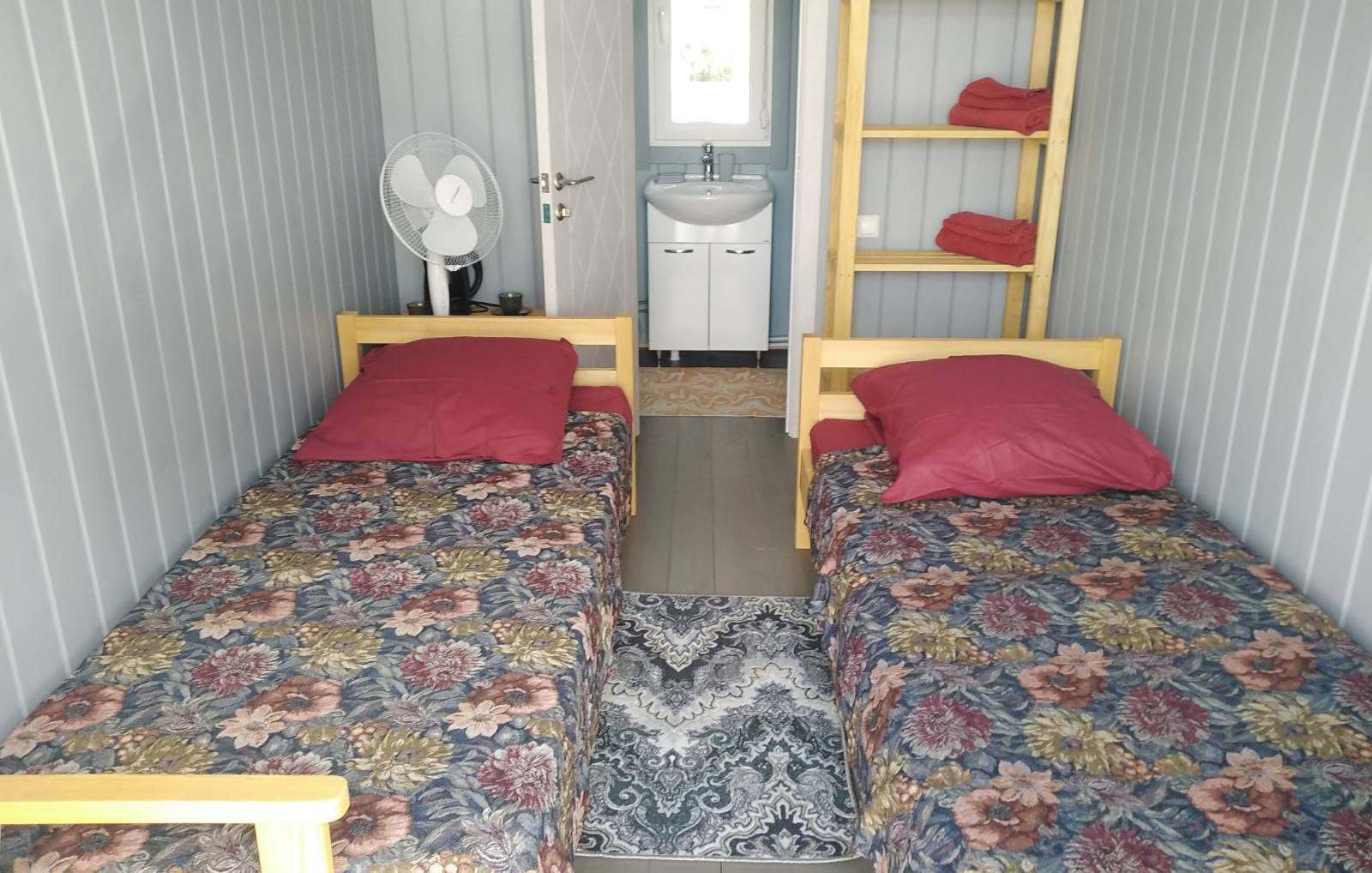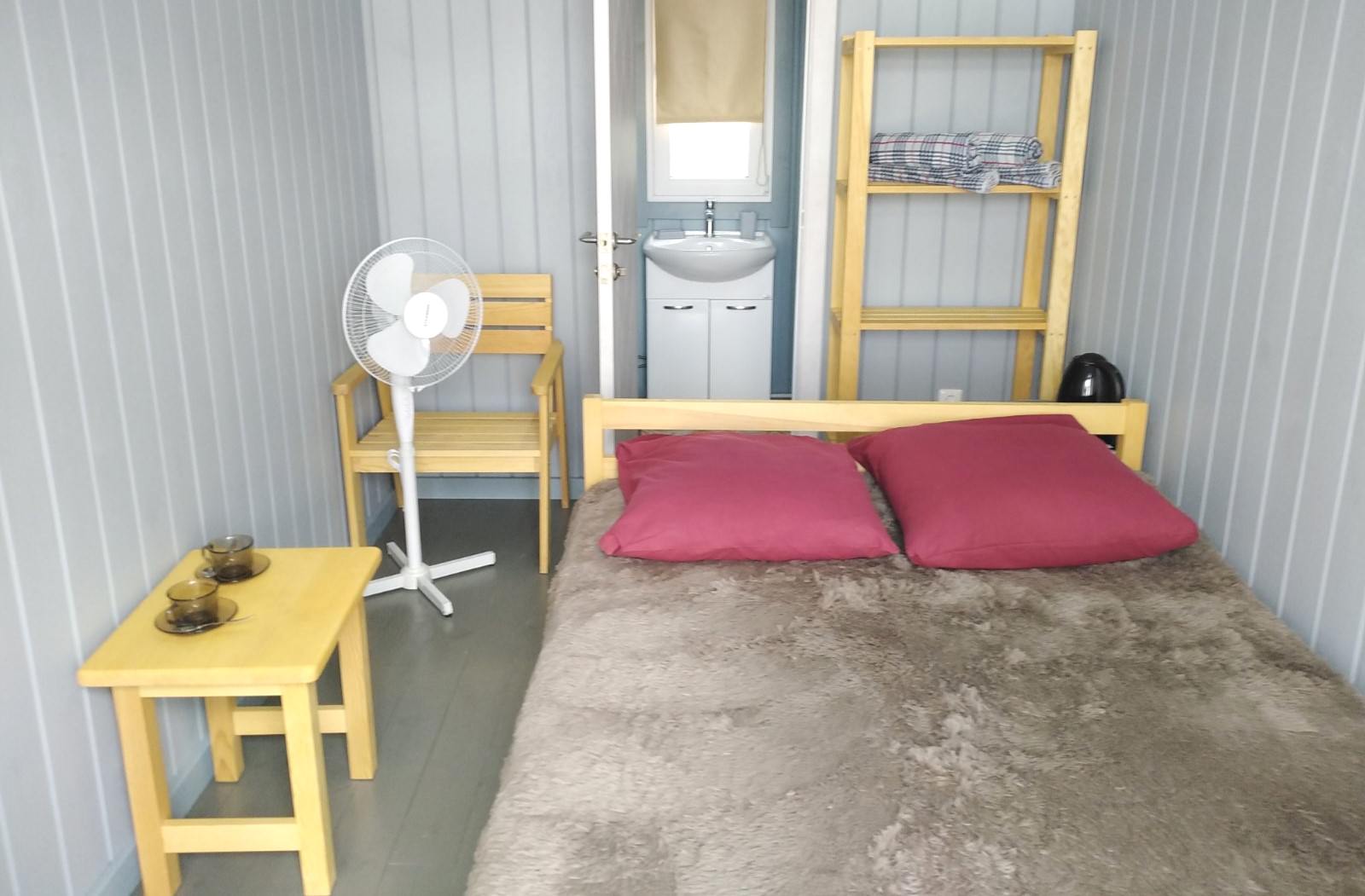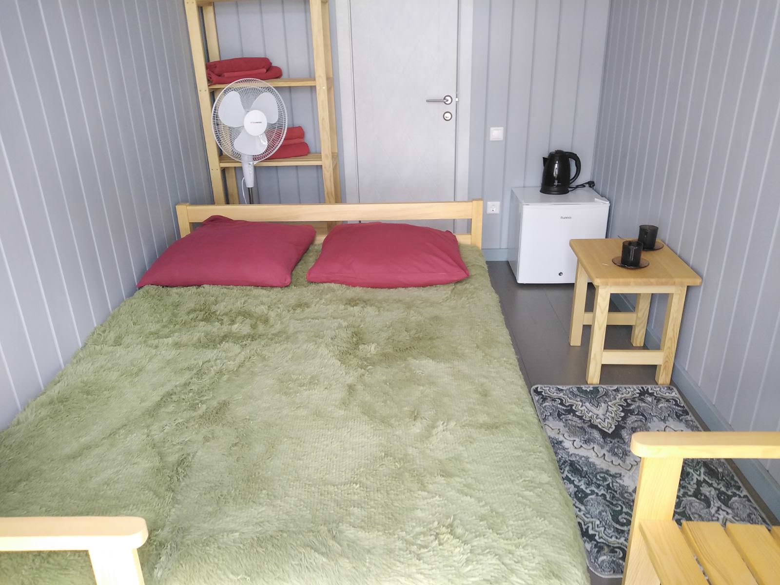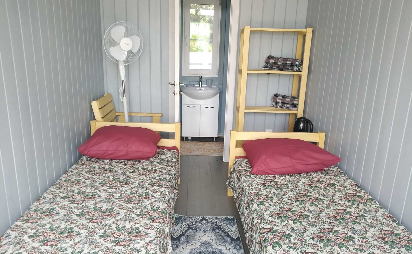 Площадь номера - 12,5 кв.м. 2 осн. места. Мебель: вешалка, кровати односпальные /одна двуспальная кровать, стол, стулья, шкаф (стеллаж с полками). Оборудование: вентилятор, холодильник, электрочайник. Санузел. Сервис: смена полотенец, смена постельного белья, уборка номера. Терраса.